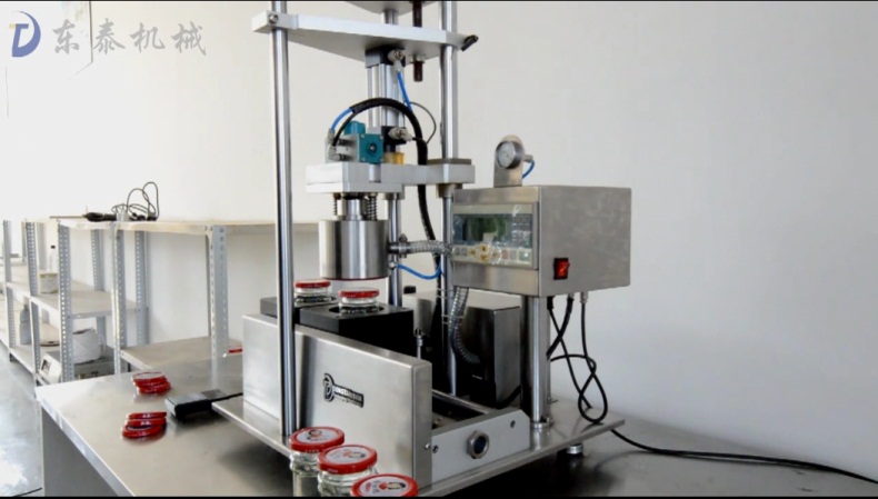 先從個詞半自動來講,半自動指的就是手動與機器相結合的操作流程:半自動玻璃瓶真空封口機是采用了人工上瓶,人工出瓶,機動旋蓋與抽真空的方式來完成流程。由于人工上瓶,并且該半自動玻璃瓶真空旋蓋機有無瓶不上蓋,無瓶不抽真空的特點,所以大大減少了對瓶蓋與瓶身的損害。并且人工與機器的配合絲毫不浪費時間,比純手工的生產效率要幾倍,還更節省人力,一臺機器只需一個人便可輕松完成。